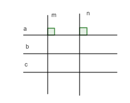 Bài 2 (3.33). Vẽ ba đường thẳng phân biệt a,b,c sao cho a // b, b // c và hai đường thẳng phân biệt m,n cùng vuông góc với a. Hỏi trên hình có bao nhiêu cặp đường thẳng song song, bao nhiêu cặp đường thẳng vuông góc?