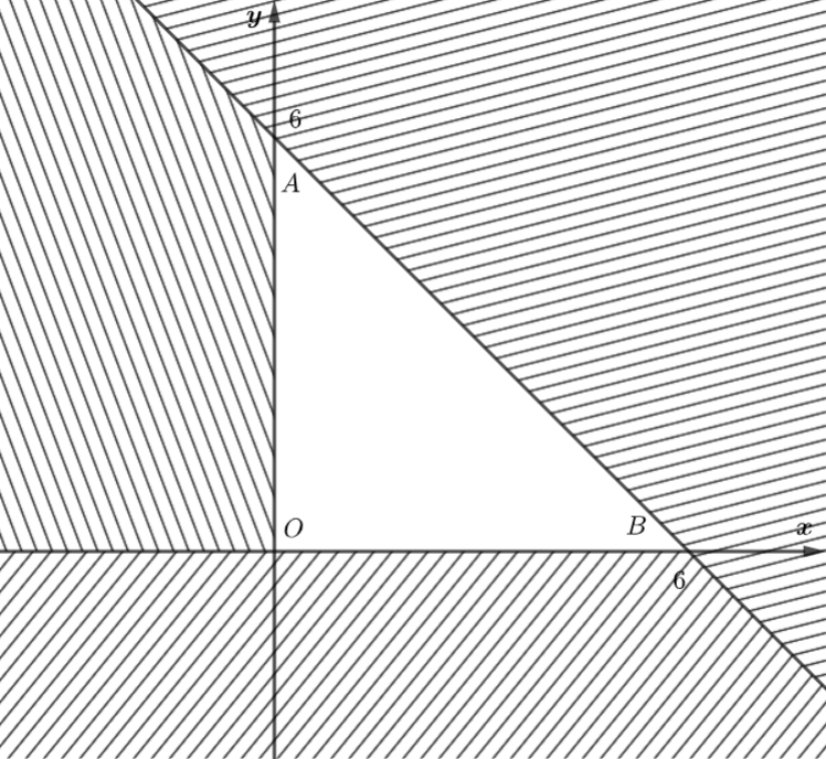 Miền các định của hệ phương trình đã cho là \(\Delta OBC\) có \(A\left( {0;6} \right),\,\,B\left( {6;0} \right)\)