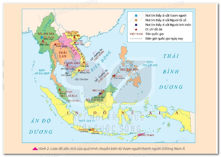 Dựa vào Lược đồ hình 2 (trang 18, SGK), em có nhận xét gì về sự phân bố những dấu tích của quá trình chuyến biến từ Vượn người thành người ở Đông Nam Á?