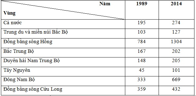 – Cả nước tăng từ 195 người/km2 (1989) lên 274 người/km2 (2014), tức là tăng thêm 79 người/km2 trong vòng 25 năm.