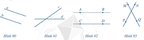 Đọc tên hai đường thẳng song song, hai đường thẳng cắt nhau trong Hình 90, Hình 91, Hình 92, Hình 93.