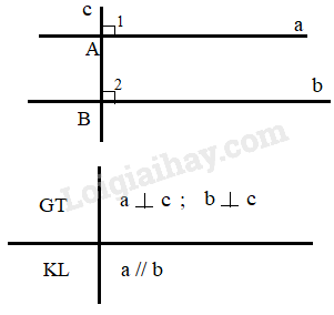 Cho định lí: “ Hai đường thẳng phân biệt cùng vuông góc với một đường thẳng khác thì chúng song song với nhau.” a) Vẽ hình minh họa nội dung định lí trên. b) Viết giải thiết, kết luận của định lí trên. c) Chứng minh định lí trên.