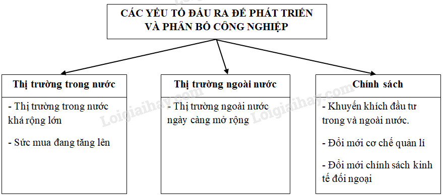 Giải bài 2 trang 16 tập bản đồ Địa lí 9, Dựa vào nội dung SGK và kiến thức đã học, em hãy hoàn chỉnh sơ đồ các yếu tố đầu ra của phát triển và phân bố công nghiệp.