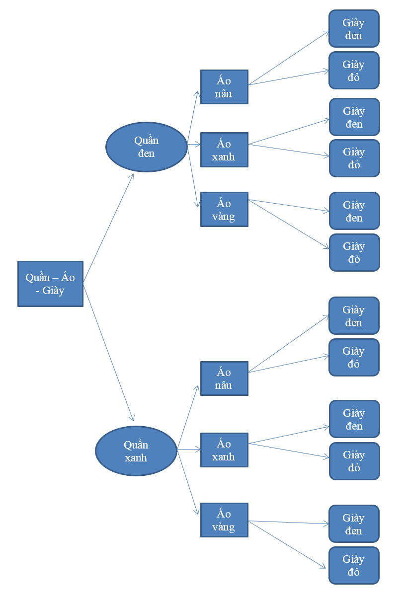 Bạn Dương có 2 chiếc quần gồm: một quần màu xanh và một quần màu đen; 3 chiếc áo gồm: một áo màu nâu, một áo màu xanh và một áo màu vàng, 2 đôi giày gồm: một đôi giày màu đen và một đôi giày màu đỏ. Bạn Dương muốn chọn một bộ quần áo và một đôi giày để đi tham quan. Bằng cách vẽ sơ đồ hình cây, tính số cách chọn một bộ quần áo và một đôi giày cho bạn Dương.