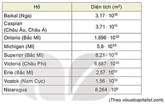 Diện tích một số hồ nước ngọt lớn nhất thế giới được cho trong bảng sau. Em hãy sắp xếp chúng theo thứ tự diện tích từ nhỏ đến lớn.
