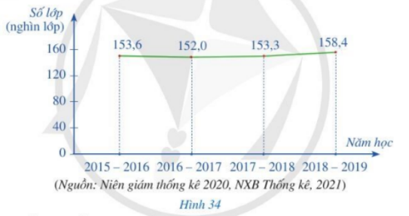Biểu đồ đoạn thẳng trong Hình 34 biểu diễn số lượng lớp học ở cấp trung học cơ sở (THCS) của Việt Nam trong các năm học 2015 – 2016, 2016 – 2017, 2017 – 2018, 2018 – 2019.