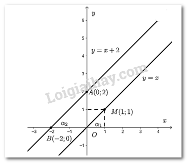 b) Góc tạo bởi hai đường thẳng  \(y = x\) và \(y = x + 2\) với trục \(Ox\) lần lượt là \({\alpha _1}\) và \({\alpha _2}\).
