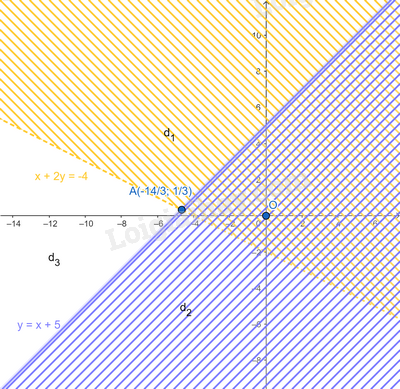 Xét phương trình hoành độ giao điểm của hai đường thẳng \(x + 2y =  – 4\) và \(y = x + 5\), ta được: