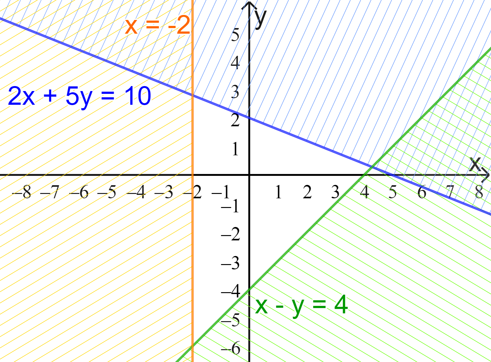 b) \(\left\{ \begin{array}{l}4x + 10y \le 20\\x – y \le 4\\x \ge  – 2\end{array} \right.\)