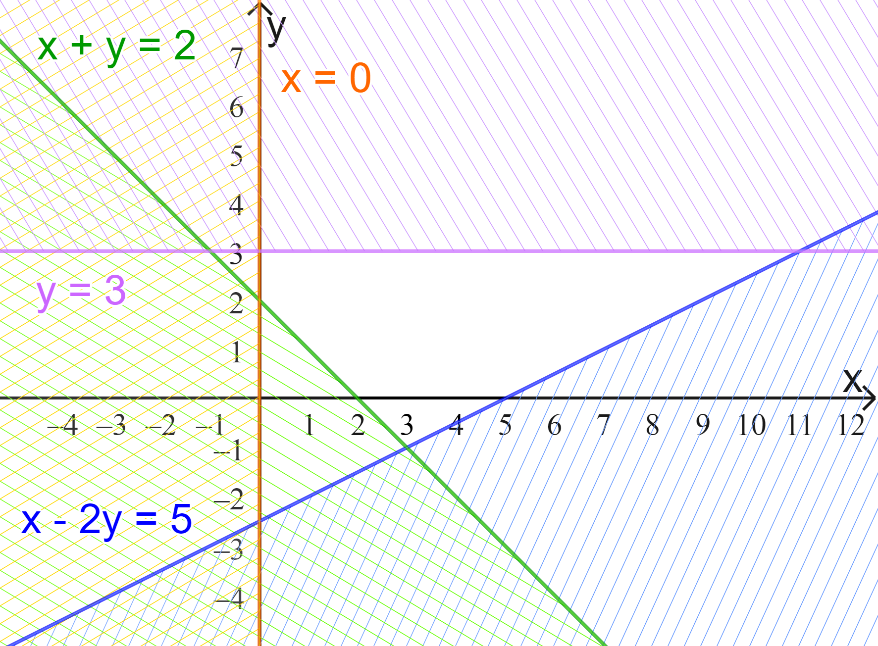 c) \(\left\{ \begin{array}{l}x – 2y \le 5\\x + y \ge 2\\x \ge 0\\y \le 3\end{array} \right.\)