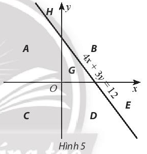 Đường thẳng 4x + 3y = 12 và hai trục tọa độ chia mặt phẳng Oxy thành các miền như hình 5. Hãy tìm hệ bất phương trình có miền nghiệm là miền B (kể cả bờ)