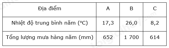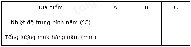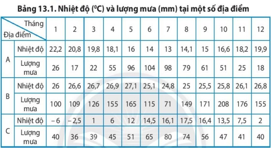 1. Dựa vào bảng 13.1, hãy tính nhiệt độ trung bình năm và tổng lượng mưa các điểm A, B, C để điền vào bảng dưới đây: