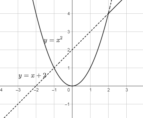 Ta vẽ đồ thị hàm số \(g\left( x \right) = {x^2}\) và giữ lại phần đồ thị ứng với \(x \le 2\), ta cũng vẽ đồ thị hàm số \(h\left( x \right) = x + 2\)và giữ lại với phần đồ thị \(x > 2\). Ta được đồ thị cần vẽ như sau