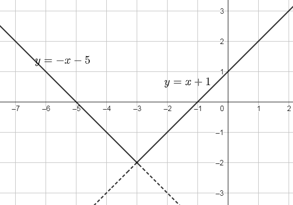 Ta vẽ đồ thị hàm số \(g\left( x \right) = x + 1\) và giữ lại phần đồ thị ứng với \(x \ge  – 3\), ta cũng vẽ đồ thị hàm số \(h\left( x \right) =  – x – 5\)và giữ lại với phần đồ thị \(x <  – 3\). Ta được đồ thị cần vẽ như sau