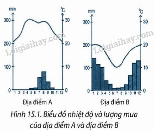 Quan sát biểu đồ nhiệt độ và lượng mưa của địa điểm A và địa điểm B, em hãy cho biết: