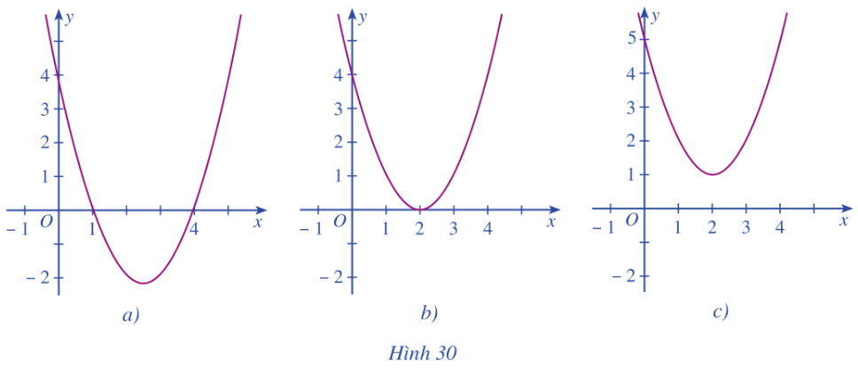 Dựa vào đồ thị hàm số bậc hai \(y = f\left( x \right)\) trong mỗi Hình 30a, 30b, 30c, hãy viết tập nghiệm của mỗi bất phương trình sau: \(f\left( x \right) > 0;f\left( x \right) < 0;\)\(f\left( x \right) \ge 0;f\left( x \right) \le 0\).