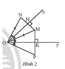 Cho góc xOy bằng \({45^o}\) và điểm M nàm trong góc xOy. Vẽ điểm N sao cho Ox là trung trực của MN, vẽ điểm P sao cho Oy là đường trung trực của MP.