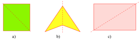 Ở hình c: Đường nét đứt không là trục đối xứng của hình vì nếu gấp hình theo đường nét đứt, ta không được 2 phần hình chồng khít lên nhau.
