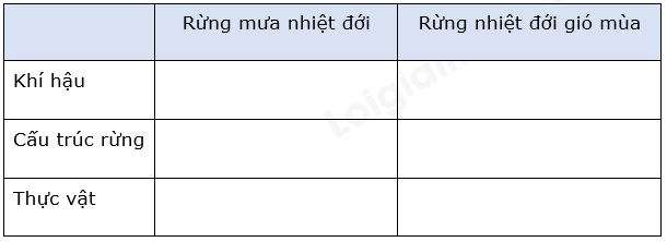 Hãy hoàn thành bảng theo mẫu sau để so sánh đặc điểm của rừng mưa nhiệt đới và rừng nhiệt đới gió mùa.