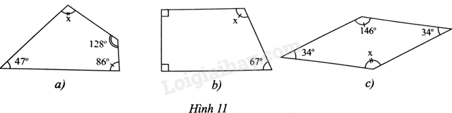 Hình 11a: \(x = {360^0} – {47^0} – {86^0} – {128^0} = {99^0}\)