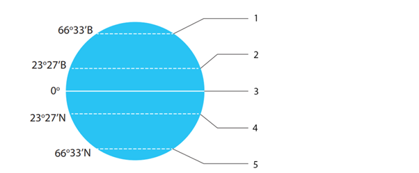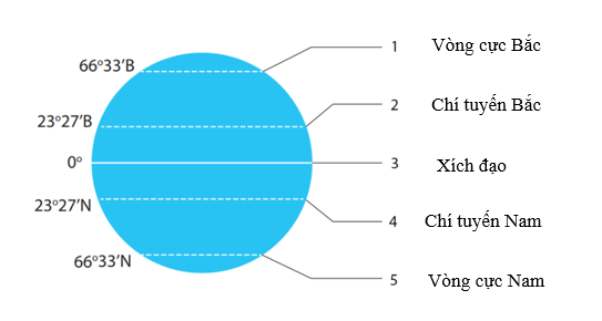 Hãy chú thích cho hình sau dựa vào các dữ liệu: Xích đạo, chí tuyến Bắc, chí tuyến Nam, vòng cực Bắc, vòng cực Nam.