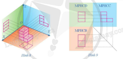 Phương pháp góc chiếu thứ nhất là phương pháp biểu diễn cac hình chiếu bằng, hình chiếu cạnh, hình chiếu đứng của vật thể trên cùng một mặt phẳng (bản vẽ) theo thứ tự trong hình 9.