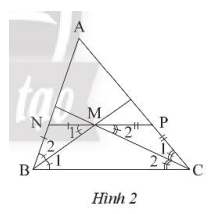 Dẫn đến \(\widehat {{M_2}} = \widehat {{C_1}}\)(cùng bằng \(\widehat {{C_2}}\)), suy ra tam giác PMC cân tại P nên  MP = CP