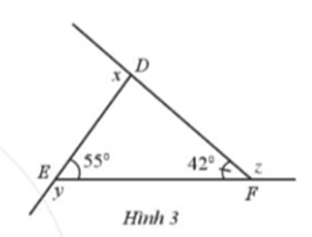 Suy ra: \(\widehat {E{\rm{D}}F} = {180^o} – \widehat {DEF} – \widehat {DF{\rm{E}}} = {180^o} – {55^o} – {42^o} = {83^o}\)