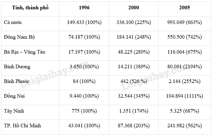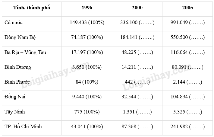 Từ bảng số liệu đã cho, hãy tính tốc độ tăng trưởng giá trị sản xuất công nghiệp của Đông Nam Bộ và các tỉnh, thành phố trong vùng cũng như của cả nước trong giai đoạn 1996 – 2005 (điền số liệu đã tính vào bảng dưới đây).