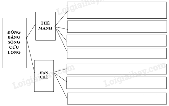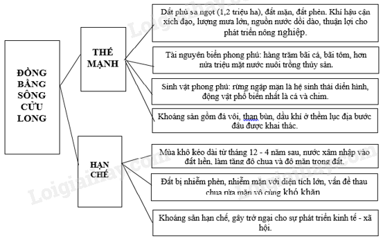 Căn cứ vào kiến thức trong SGK Địa lí 12, hãy điền vào sơ đồ dưới đây các thế mạnh và hạn chế chủ yếu về tự nhiên để phát triển kinh tế ở đồng bằng sông Cửu Long.