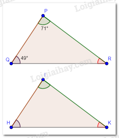 Cho biết \(\Delta PQR = \Delta IHK\),\(\widehat P = 71^\circ ,\widehat Q = 49^\circ \). Tính số đo góc K của tam giác IHK.