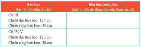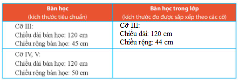 Em hãy vẽ bảng theo mẫu rồi cùng các bạn đo độ dài của bàn học để hoàn thiện bảng, sau đó đối chiếu với kích thước tiêu chuẩn.