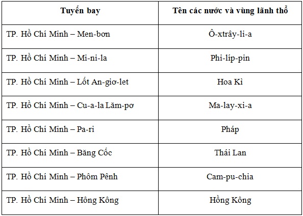 Bằng đường hàng không, từ TP. Hồ Chí Minh có thể bay trực tiếp tới nhiều nước và vùng lãnh thổ trong khu vực Đông Nam Á và thế giới. Điền tên các nước và vùng lãnh thổ phù hợp vào bảng sau: