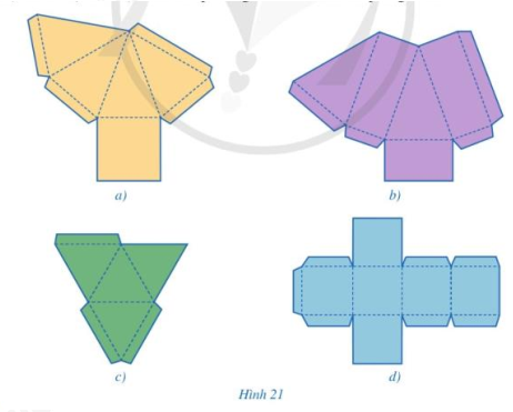 Trong các miếng bìa ở hình 21a, 21b, 21c, 21d, miếng bìa nào có thể gấp (theo các nét đứt) và dán lại để được hình chóp tam giác đều? Hình chóp tứ giác đều?