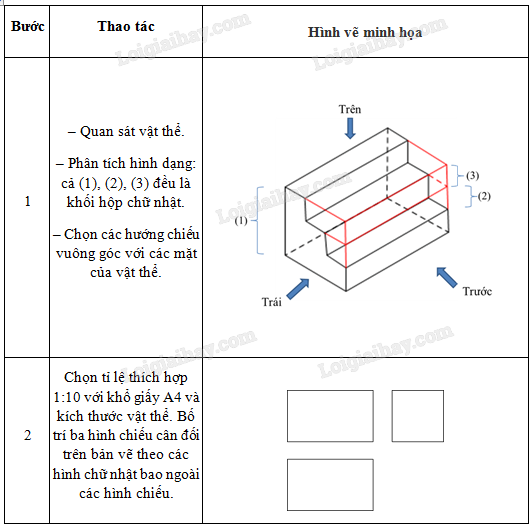 – Quan sát vật thể, phân tích hình dạng và chọn các hướng chiếu vuông góc với các mặt của vật thể.