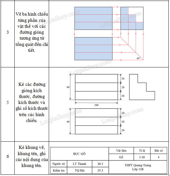 – Vẽ ba hình chiếu từng phần của vật thể với các đường gióng tương ứng từ tổng quát đến chi tiết.