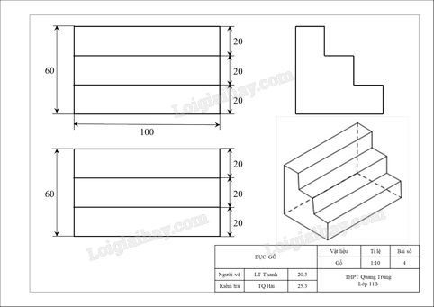 Bản vẽ kĩ thuật trên khổ giấy A4 gồm ba hình chiếu và các kích thước của cái bục gỗ có hình chiếu trục đo như Hình 14 là: