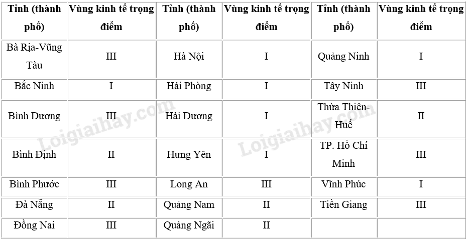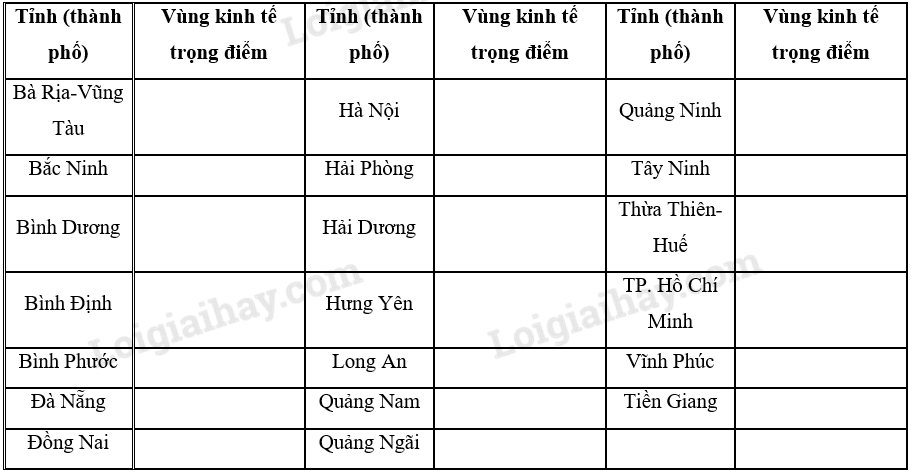 Hãy sắp xếp các tỉnh sau đây vào các vùng kinh tế trọng điểm tương ứng: