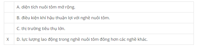 Giải bài 2 trang 93 vở bài tập Địa lí 9, Đánh dấu (X) vào ý đúng. Nghề nuôi tôm xuất khẩu ở Đồng bằng sông Cửu Long phát triển không phải do: A. diện tích nuôi tôm mở rộng. B. điều kiện khí hậu thuận lợi với nghề nuôi tôm. C. thị trường tiêu thụ lớn. D. lực lượng lao động trong nghề nuôi tôm đông hơn các nghề khác.