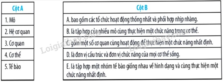 Nối các cấp độ tổ chức trong cơ thể đa bào ở Cột A với các định nghĩa tương ứng Ở Cột B.
