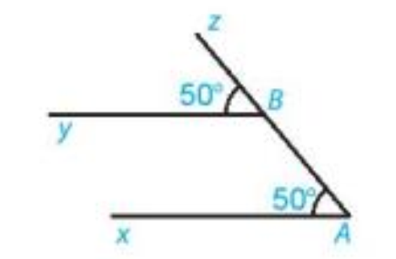 Bài 2 (3.13). Cho hình 3.9, biết \(\widehat {xAz} = {50^o},\widehat {yBz} = {50^o}\). Giải thích tại sao Ax // By.