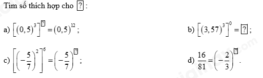 c) \({\left[ {{{\left( { – \dfrac{5}{7}} \right)}^2}} \right]^6} = {\left( { – \dfrac{5}{7}} \right)^{12}}\);
