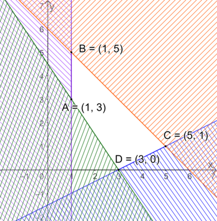 Miền nghiệm của hệ BPT là miền tứ giác ABCD (kể cả các cạnh) với A(1;3), B(1;5), C(5;1), D(3;0).