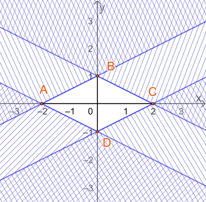 Miền nghiệm của hệ BPT là miền tứ giác ABCD (kể cả các cạnh) với A(-2;0), B(0;1), C(2;0), D(0;-1).