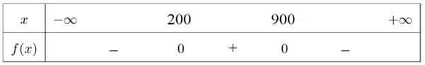 \(f\left( x \right) =  – {x^2} + 1\;100x – 180\;000\)có hai nghiệm \({x_1} = 200;{x_2} = 900\) và có hệ số \(a =  – 1 < 0\)