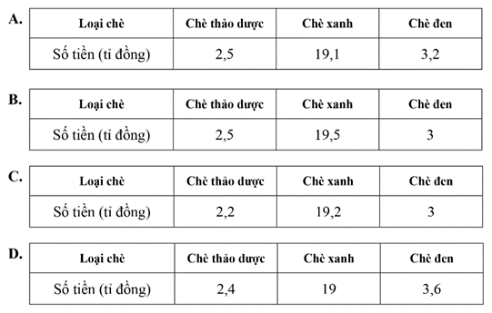 Trong năm 2020, công ty chè Phú Minh thu được 25 tỉ đồng từ việc xuất khẩu chè. Biểu đồ hình quạt tròn ở Hình 22 biểu diễn kết quả thống kê (tính theo tỉ số phần trăm) các loại chè xuất khẩu trong năm 2020 của công ty Phú Minh. Bảng nào sau đây là bảng số liệu thống kê số tiền công ty chè Phú Minh thu được ở mỗi loại chè năm 2020
