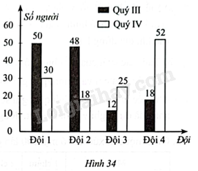 Biểu đồ cột kép trong Hình 34 biểu diễn số công nhân xếp loại Tốt trong Quý III, Quý IV của bốn đội sản xuất ở công tu Phú Bình.