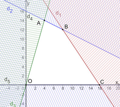 Miền nghiệm của hệ bất phương trình là miền trong tứ giác OABC với O(0; 0), A(4; 14), B(8; 12), C(16; 0).