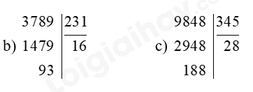 b) \(3789:231 = 16\)(dư 93);