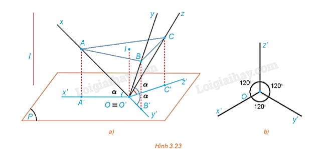 Trong HĐ7, bằng cách xét tam giác vuông OIA và tính tỉ số \(\frac{{IA}}{{OA}}\) , chứng minh rằng trong phép chiếu trục đo vuông góc đều thì \(p = q = r = \frac{{\sqrt 6 }}{3}\).